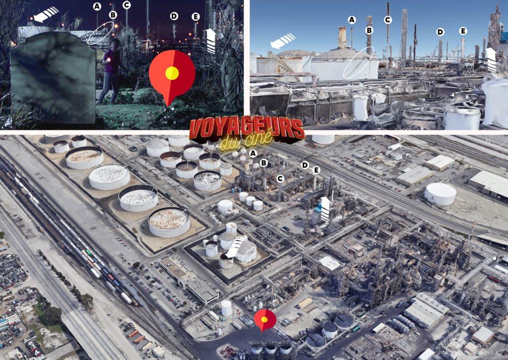 A vrai dire, ce cimetière n’existe pas. La scène a été tournée dans le quartier de Wilmington de Los Angeles. C’est le port industriel de la ville, on y trouve des raffineries. Lieu idéal pour donner le style chaos du 1985 alternatif que Biff Tannen a créé.