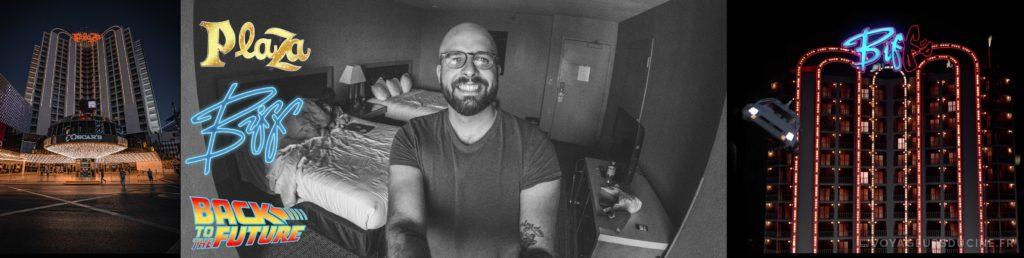 Laissez moi vous présenter à présent un lieu emblématique de ce deuxième volet de retour vers le futur. J’ai nommé: Le Pleasure Paradise Casino & Hôtel de Biff Tannen. Cet hôtel est en réalité celui du Plaza Hotel de Las Vegas situé juste en face de la Fremont Street Expérience. Cette célèbre rue touristique, recouverte par un écran géant de 500 mètres. Pour la petite histoire, tout comme dans Retour vers le futur, ici, c’est le chaos. En effet, on découvre beaucoup de misère dans cette rue ultra touristique ce qui, pour ne rien vous cacher, gâche un peu la fête. Car oui, nous avons eu la chance de pouvoir passer la nuit dans l’hotel de Biff Tannen.