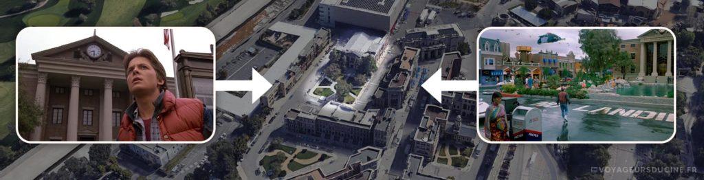 Cette place s’appelle Courthouse Square et se trouve au Universal Studios de Los Angeles dont l’accès coûte environ 125 $. Bien que ce petit centre-ville garde sa structure générale identique, ce sont des studios de cinéma dont les décors changent sans cesse. C’est pourquoi, la place est visible dans de nombreux films (ex : Gremlins, Batman and Robin, Amistad, clip offspring) et ne ressemble plus exactement à ce que l’on peut voir dans Retour vers le futur.