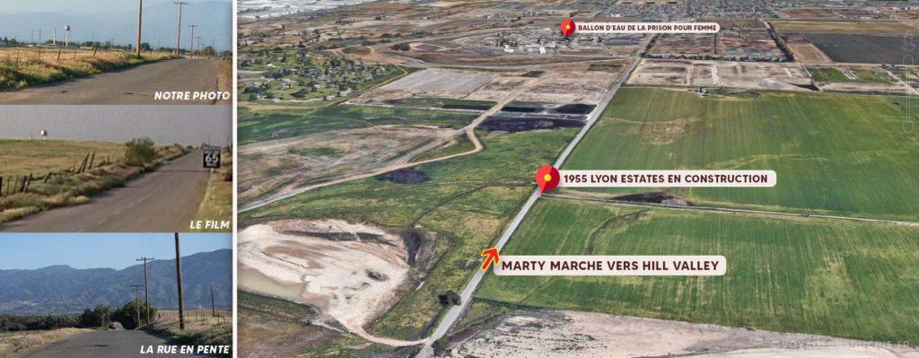 Je pense que la scène n’a pas été tourné en cohérence avec le lieu, Marty se trouve entre Lyon Estates et la prison pour femme en théorie, alors qu’en réalité, il marche sans doute en amont. Effectivement la route est en pente, si l’on avait continué, on aurait sûrement pu avoir une vue similaire.